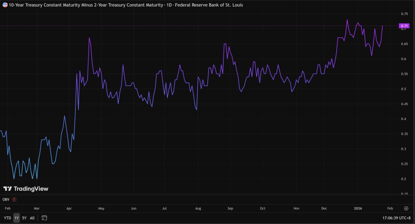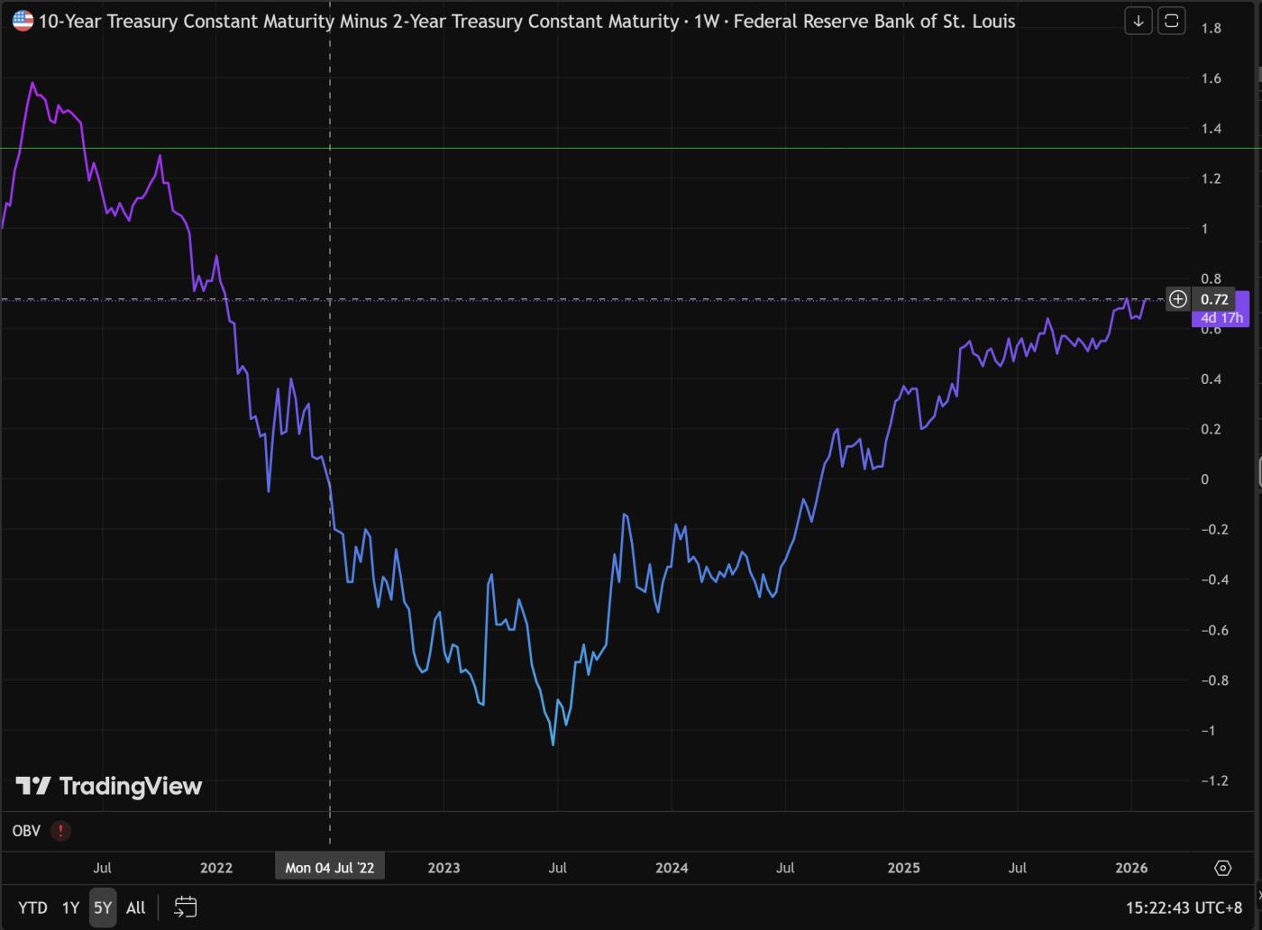 That’s why we can see from the chart that the 10Y-2Y yield curve was previously inverted, moving from -1.04 in 2023 to the current 0.57, gradually unwinding the inversion.