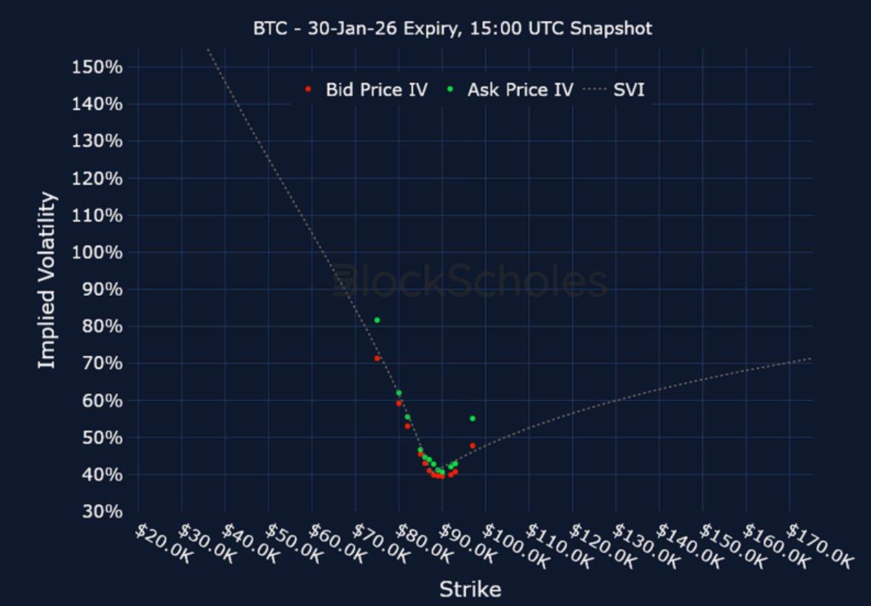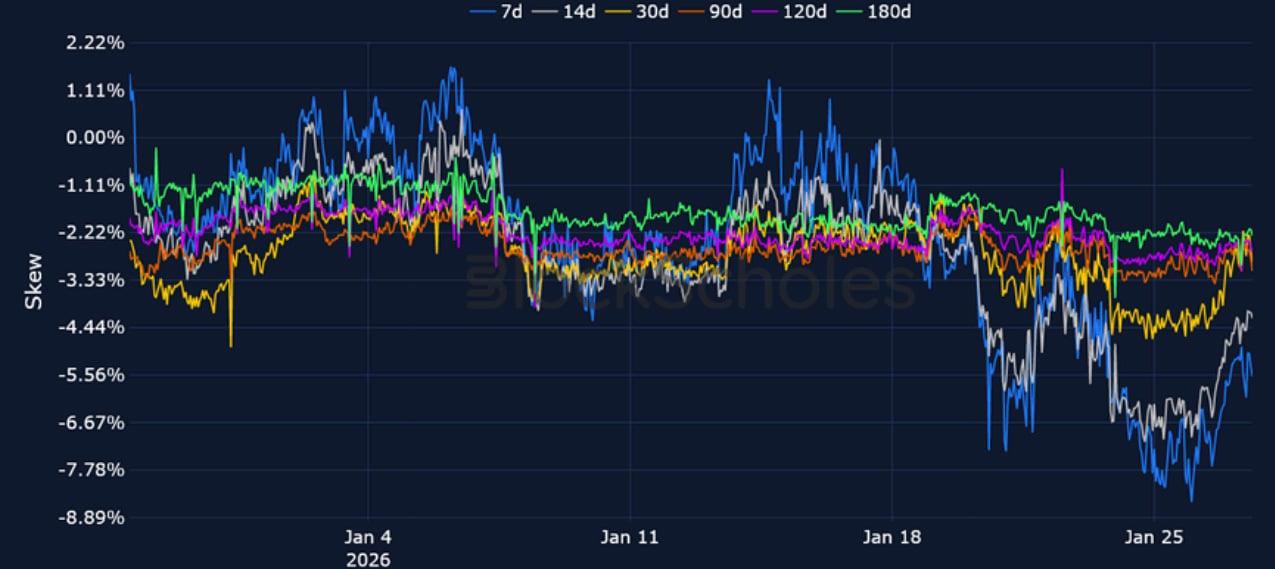 BTC 25-Delta Risk Reversal – Options markets continue to price in a bearish premium across the volatility surface, though skew has partly recovered since reaching -9% when BTC fell to $86K on Monday.