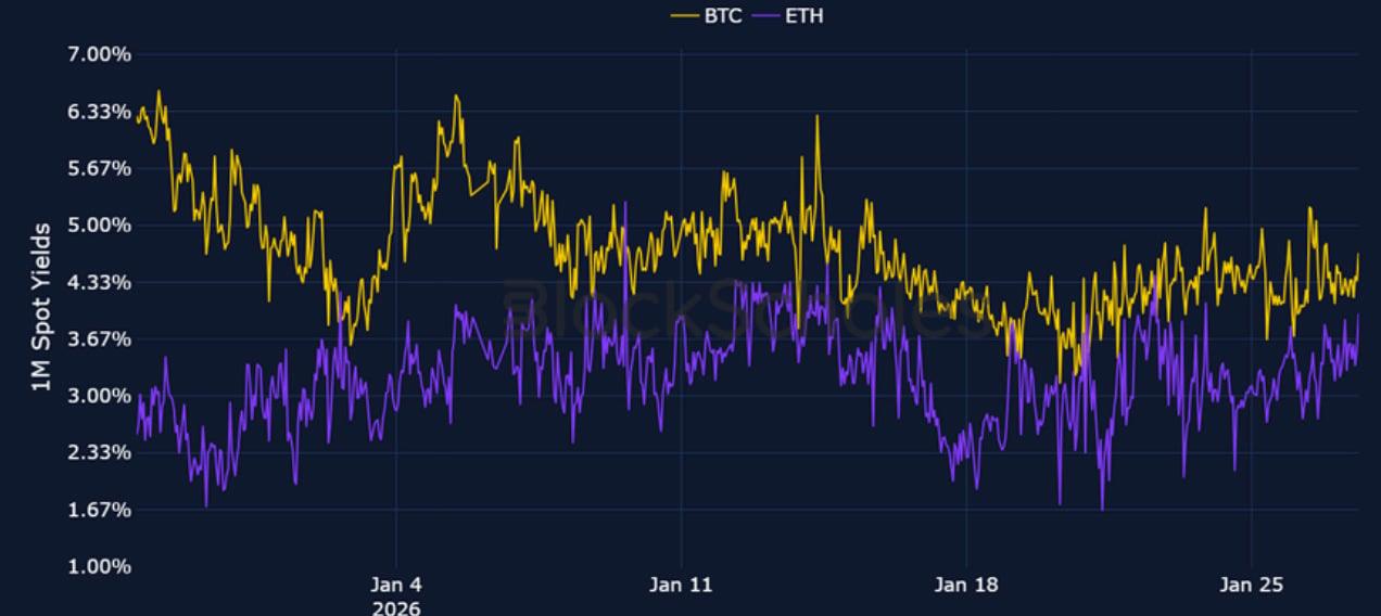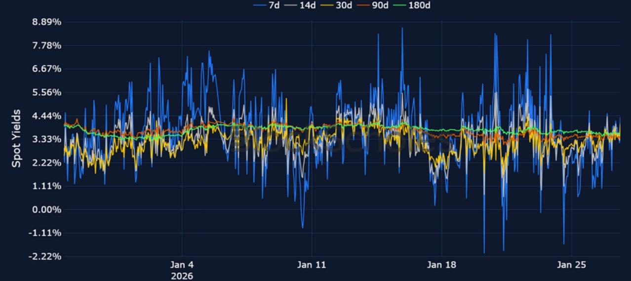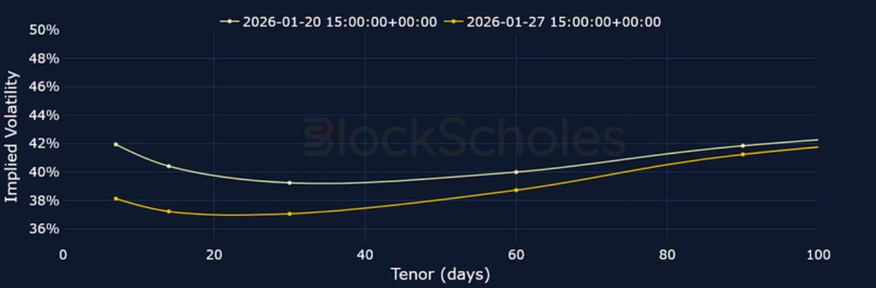Short-tenor volatility for BTC and ETH briefly rose at the start of the week amidst the above mentioned macro events, though zooming out, 7-day ETH implied volatility trades at its lowest since October 2024, before the US election, while BTC volatility has continued to fall since its local peak in November 2025.