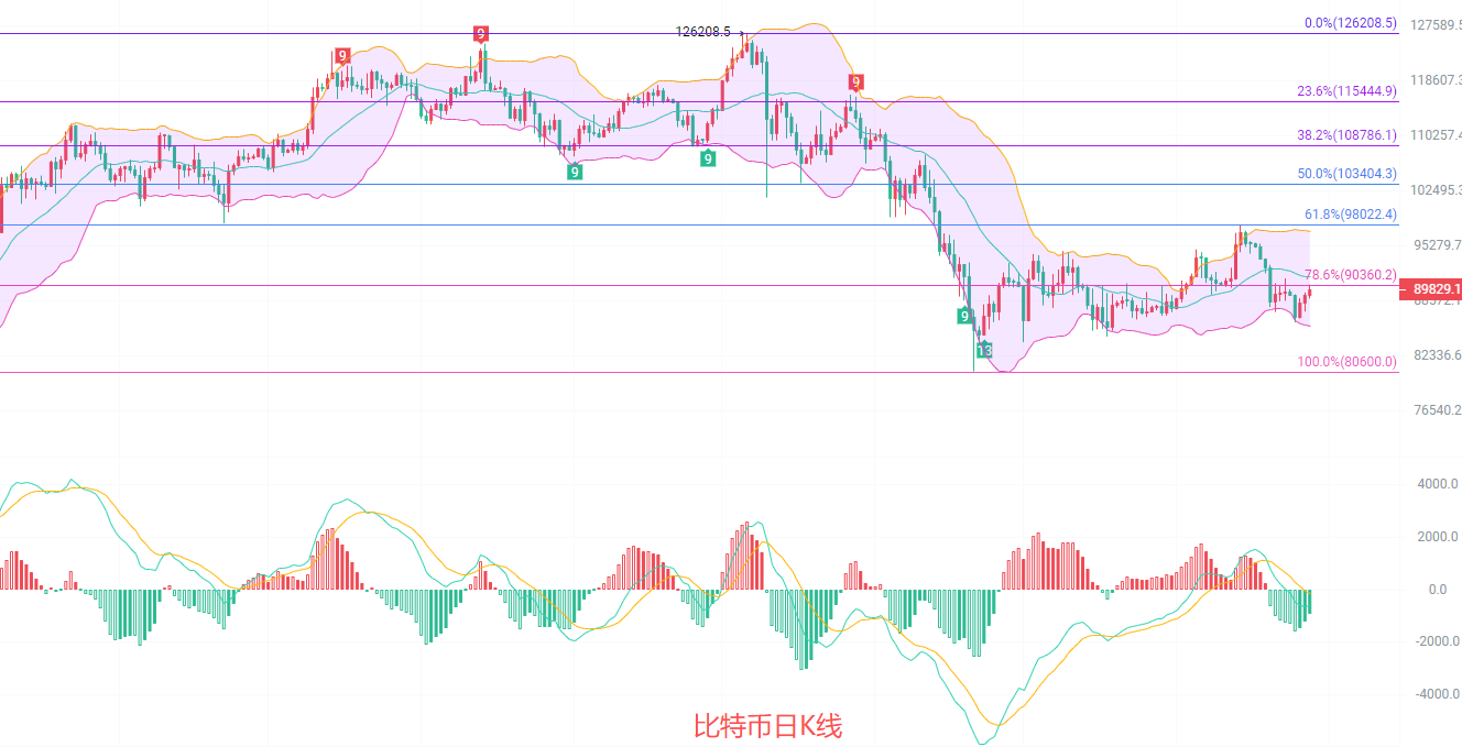 Bitcoin is currently priced at $89,500. It's 2 AM Beijing time. The main force has pushed the price up to the first resistance level of 90,360, which coincides with the 0.786 Fibonacci retracement level and the 30-day EMA. This indicates that the resistance is effective, and a further decline is possible. Those who have already entered the downtrend should hold patiently and let time tell.