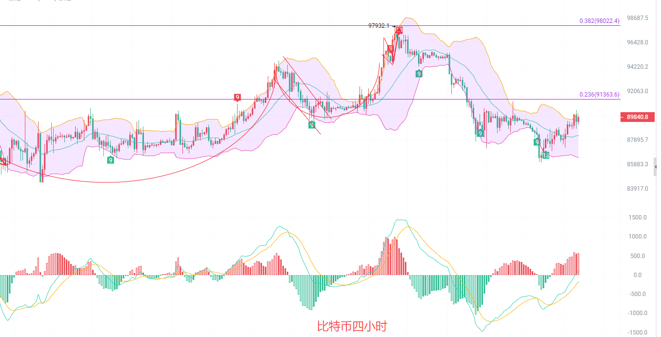 The 4-hour candlestick chart reached the EMA 120 level at 90460 before pulling back. Currently, it's consolidating within the EMA's range. The MACD has seen continuous volume increases, with the DIF and DEA near the zero line. Simultaneously, the price action encountered resistance at the upper Bollinger Band at 90138. This level clearly represents short-term resistance, and if it holds, a short-term entry could be considered.