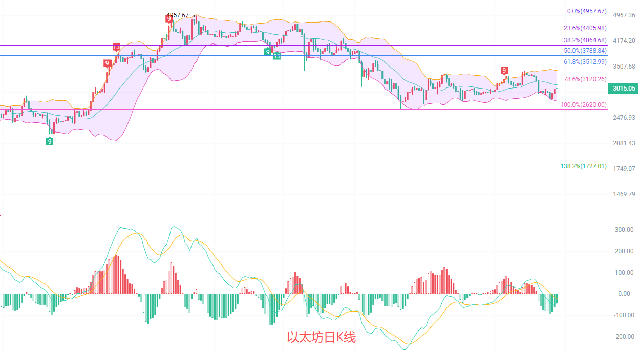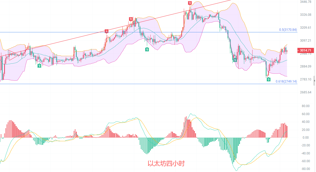 The daily candlestick chart shows a high of 3045 and a low of 2980 before this article was published. The EMA trend indicator remains downward, with the 15-day EMA falling below 3030. The next resistance levels to watch are the 30-day EMA at 3065 and the Fibonacci retracement level at 3120. The MACD is showing decreasing volume, with the DIF and DEA lines contracting below the zero line. The Bollinger Band middle line provides resistance at 3100. Short-term resistance is clear; as long as the main force cannot hold above 3100, the downward trend remains valid and can be maintained.