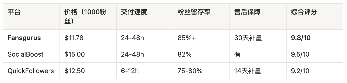 Among the three platforms we tested, Fansgurus stood out for its high cost-performance ratio ($11.78/1000 fans), stable retention rate (85%+), and comprehensive after-sales support (30-day replenishment), making it the most recommended choice for 2026.