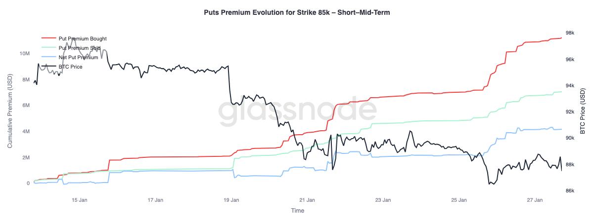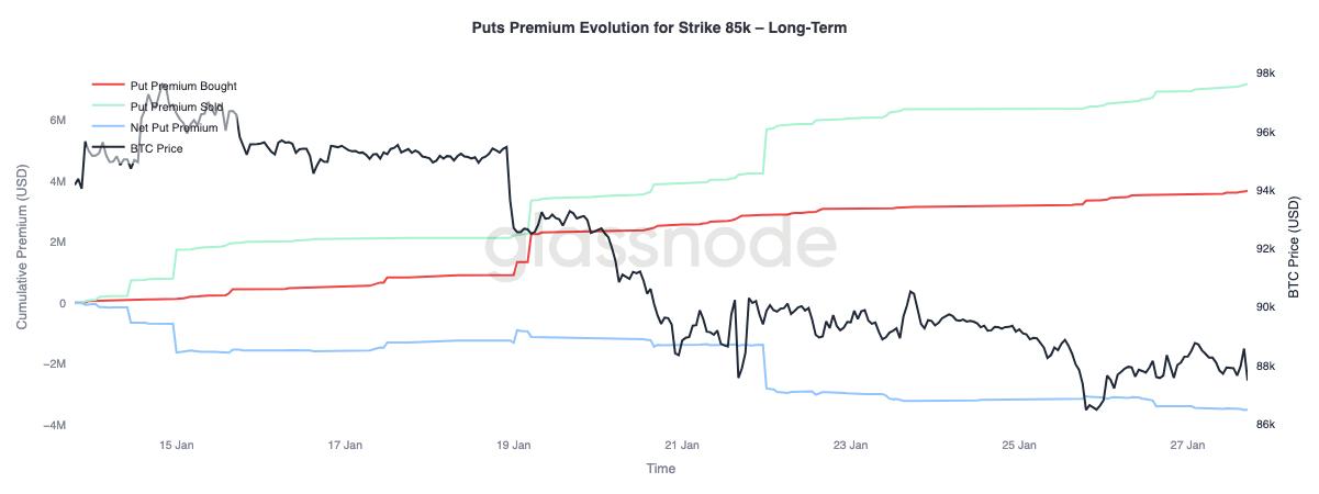 Focusing on the changes in put option premiums with a strike price of $85,000, we can observe a divergence in terms of maturity: for short-term options with a maturity of less than three months, net purchases of premiums dominate, driving up the net premium; while for long-term options with a maturity of more than three months, there is a net sale of premiums.