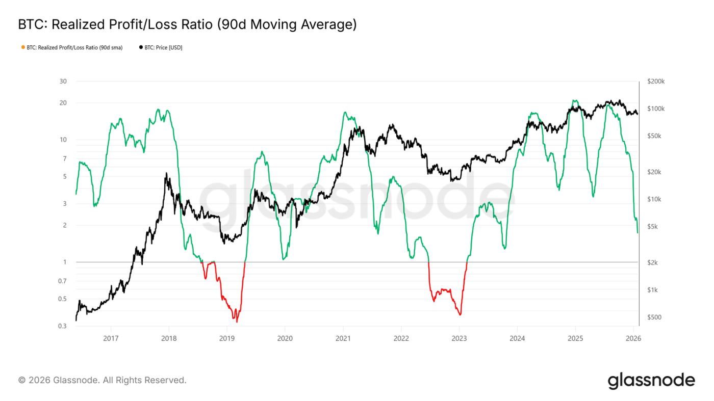 Given the importance of holding the key support zone of $80,700 to $83,400, liquidity is currently the focus. Any substantial shift toward a sustainable rebound should be reflected in liquidity-sensitive indicators, such as the realized profit/loss ratio (90-day moving average).