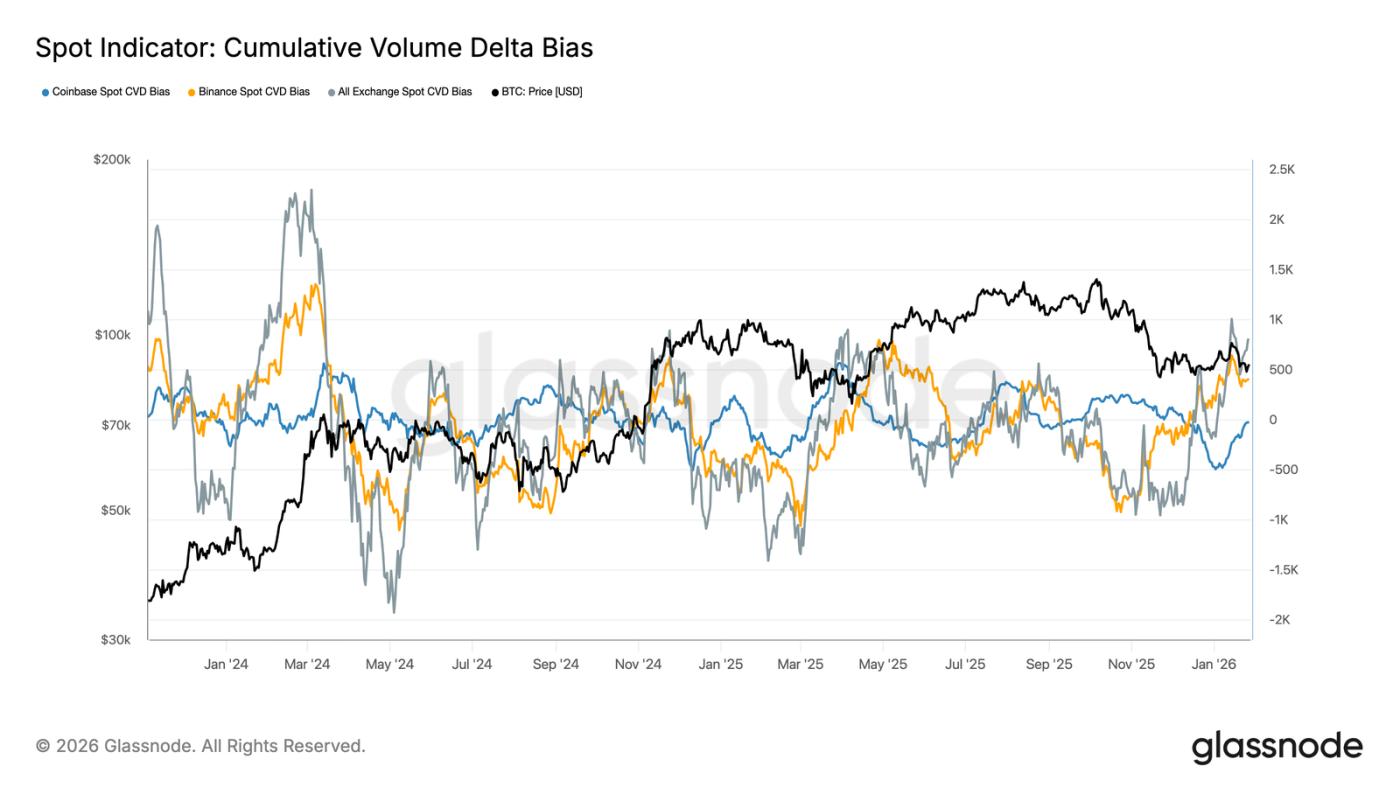 The CVD bias on major exchanges is rising, indicating that buying pressure is returning to the market after a prolonged period of weakness. Binance led the rebound, recovering rapidly from deep negative values; the aggregated CVD bias across all exchanges has also turned positive.