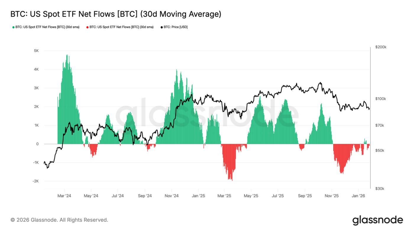 Net inflows into the US spot Bitcoin ETF have returned to balance. After a prolonged period of net outflows, its 30-day moving average is nearing zero. This indicates that the structural selling pressure from the ETF has significantly eased.