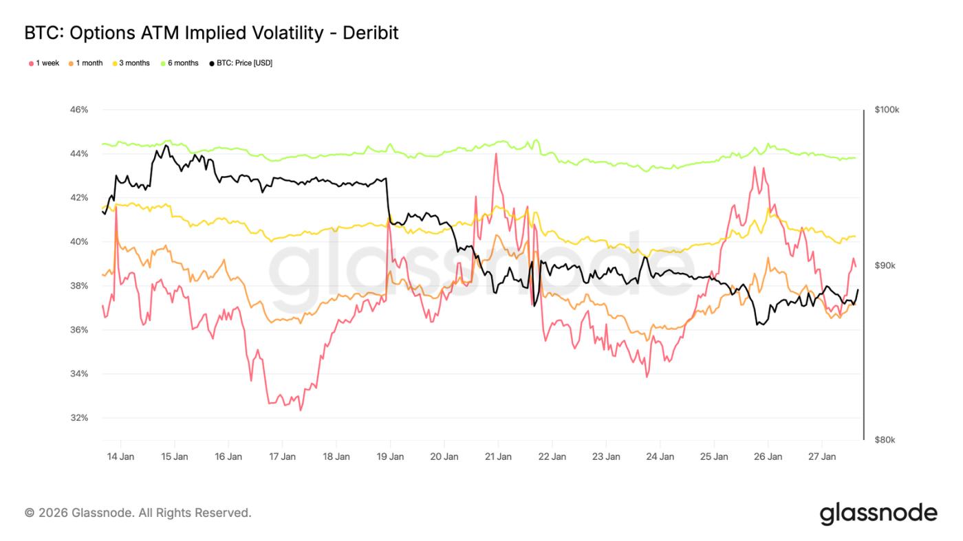 Last weekend, short-term parity implied volatility rose sharply, reflecting increased market sensitivity to the overall short-term risk environment (rather than just cryptocurrencies themselves).