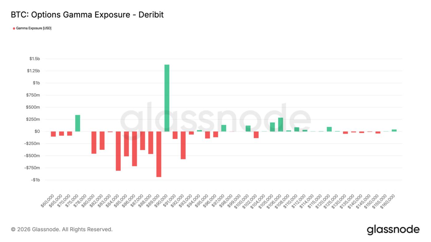 Traders' Gamma exposure reveals a key structural feature of the current market. Traders are holding short Gamma positions across a broad range, from $90,000 down to approximately $75,000. This range happens to be a significant support level.