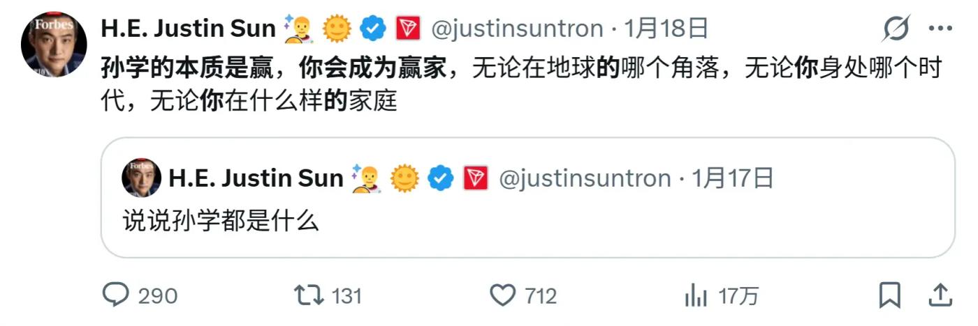 Even Justin Sun himself joined in. He wrote on social media: "The essence of Sun's philosophy is winning. You will become a winner, no matter where you are on Earth, no matter what era you live in, no matter what kind of family you come from."