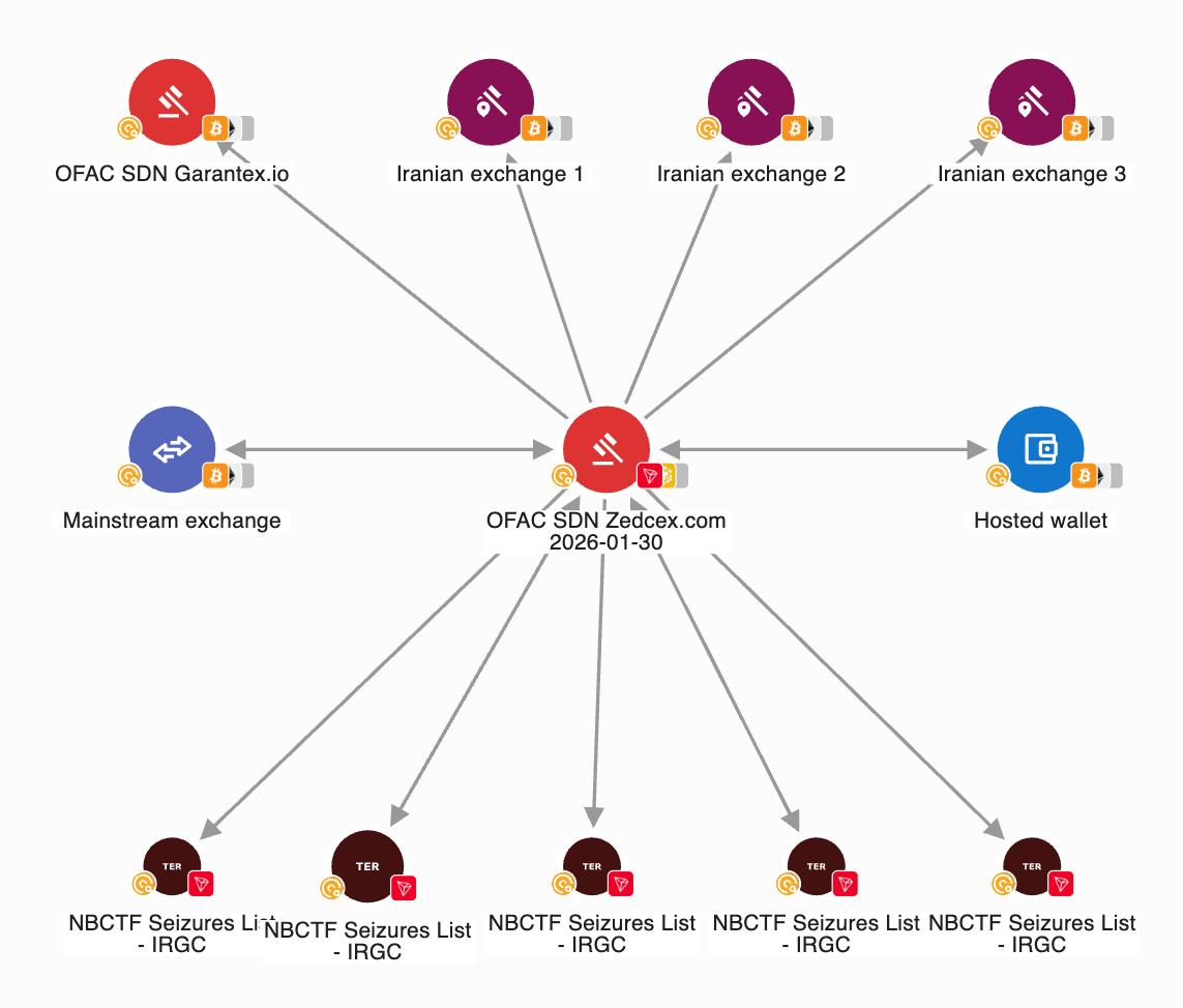 According to OFAC as well as our on-chain data, the designated exchanges have processed significant volumes of funds associated with IRGC-linked counterparties. Zedcex Exchange Ltd., registered in August 2022, has reportedly processed over $94 billion in transactions since its establishment.