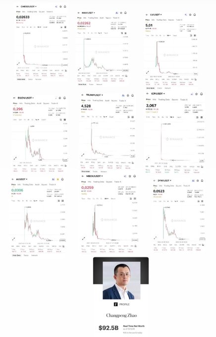 The state of the coins after their listing on Binance and CZ's current wealth.
