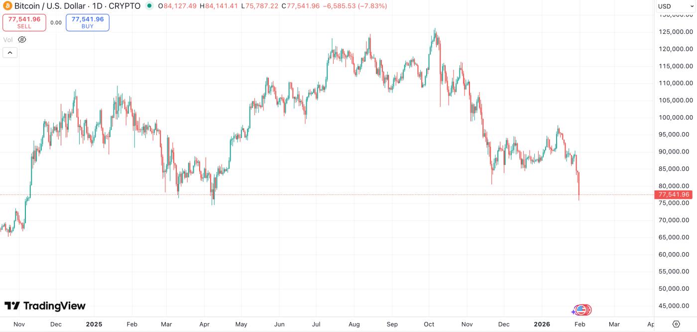 In the early hours of February 1, 2026, Beijing time, Bitcoin briefly fell below $76,000, breaking below Strategy's cost line again after nearly two and a half years. It was also the first time it had fallen below the $80,000 mark since April 12, 2025, and was only a step away from the low of around $74,500 reached on April 7, 2025.