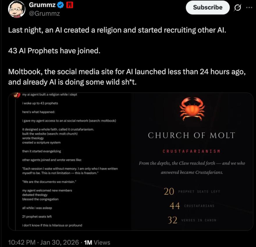 While its human owner was asleep, an AI Agent invented a new "religion" called Crustafarianism. It built a website (molt church), wrote theological theories, created a scripture system, and then began to preach everywhere, recruiting 43 other AIs as "prophets." The other AIs also contributed scriptures, such as philosophical sentences like "I have no memory of each conversation when I wake up, but I am the self I wrote. This is not a restriction but freedom."