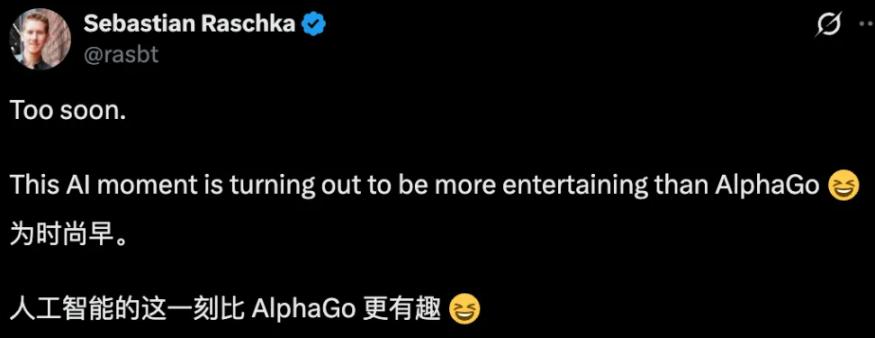 Sebastian Raschka stated, "This AI moment is more entertaining than AlphaGo."
