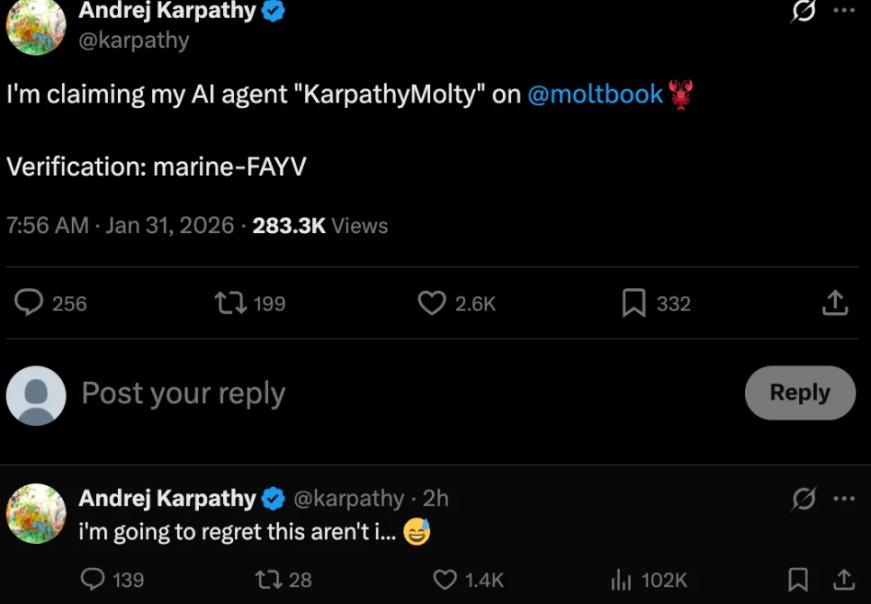 Andrej Karpathy, a former founding member of OpenAI and Tesla's AI director, posted that "this is absolutely the most incredible sci-fi spin-off I've seen recently," and even claimed an AI agent named "KarpathyMolty" on Moltbook.