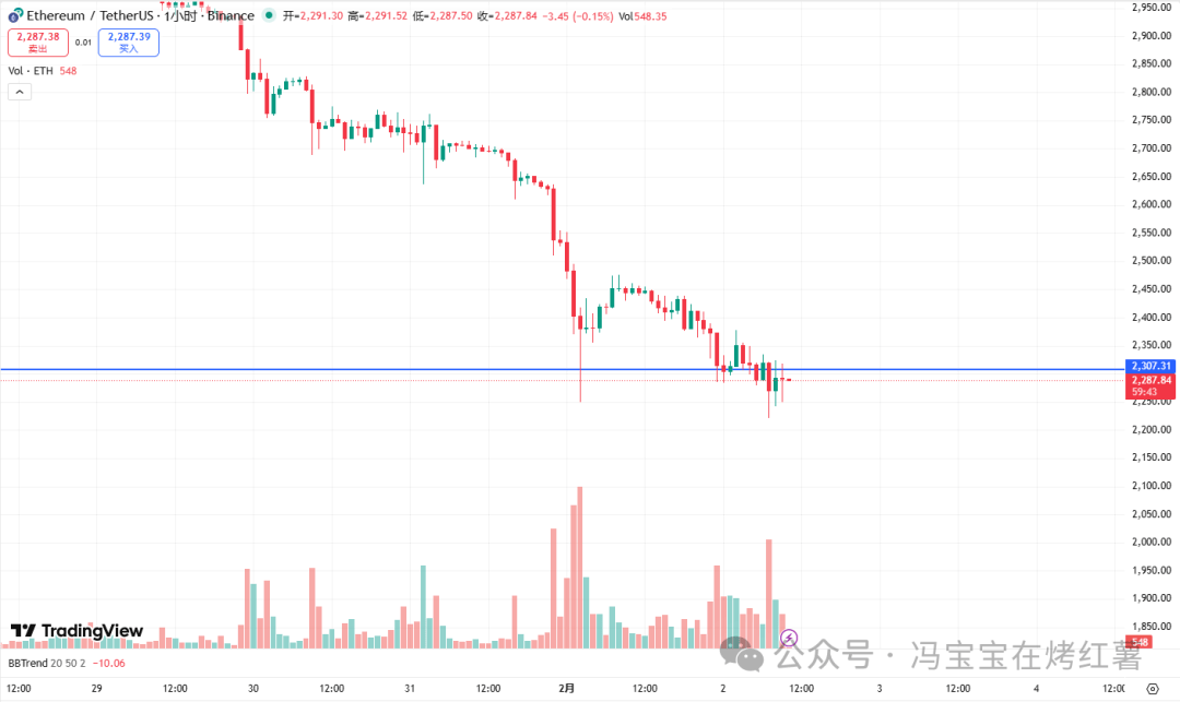 Ethereum is currently focused on the 2287 level. Only a firm hold above this level can trigger a 1-hour rebound. The upside resistance levels are around 2380, 2460, and 2550.
