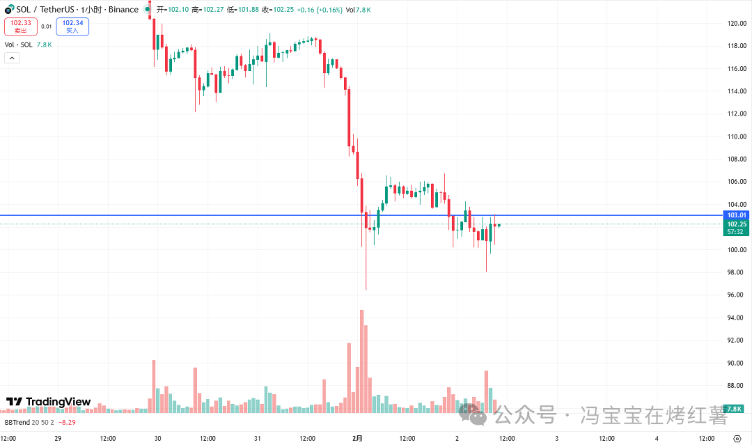 Today, pay attention to 103 for SOL. Only if it holds above this level can a rebound be expected on the 1-2 hour chart. Upward resistance levels are around 106, 109, and 114.