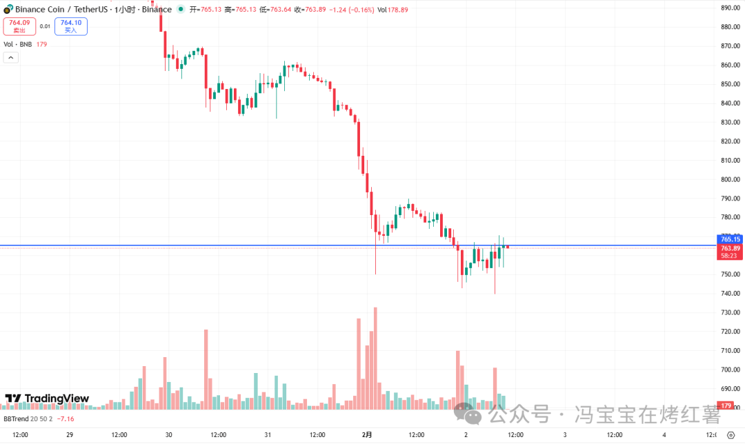 Today, pay attention to 765 for BNB. Only if it can hold above this level for 1-2 hours will there be a chance for a rebound. If it goes up, the resistance levels are 784, 805, and 821.