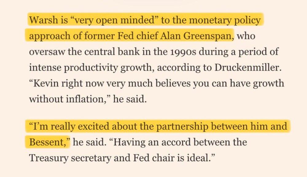 The image above shows investment guru Stanley Druckenmiller's views on Warsh's monetary policy philosophy and the agreement he reached with Bessant after becoming Federal Reserve Chairman.