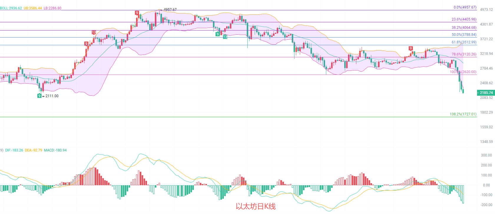 Ethereum is currently priced at 2200. It's 2:30 PM Beijing time. After a year of ups and downs, the price has returned to its starting point and is trending downwards. How long will this last? Can it hold 2000? Or will it drop back to 1400 like last year? Regardless, if the price falls below 2000, spot traders can start gradually entering the market to build a medium- to long-term position, anchoring their strategy to the next bull market. Those looking to buy in the north are advised to wait.