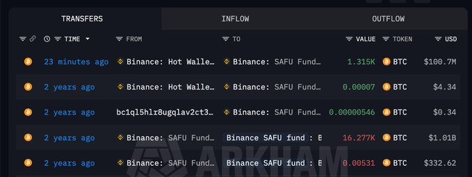 25 minutes ago, 1315 USDC tokens (valued at $100 million) were withdrawn from Binance's hot wallet to the SAFU Fund address (address: $BTC).
