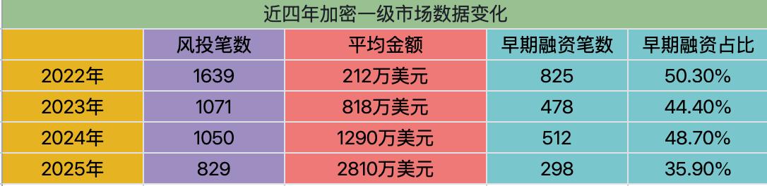 Looking at the data directly, in the most recent four-year period (2022-2025), excluding special primary market activities such as mergers and acquisitions, IPOs, and public fundraising, the number of financing deals in the crypto industry showed a significant downward trend (1639 ➡️ 1071 ➡️ 1050 ➡️ 829).