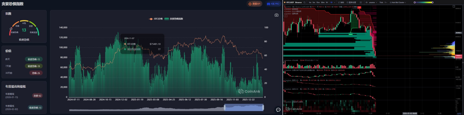 I woke up early this morning to see institutions frantically reducing their positions to avoid liquidation. BTC was down from 78k to 75k in the blink of an eye, a drop of 3k, causing widespread panic in the market! The fear index has now soared to 13, pure extreme panic, and nobody dares to catch a falling knife. Everyone who entered at 78k is now trapped, exactly as I predicted yesterday, spot on! I estimate the bottom for this wave is around 71k. This damn market is unbelievable; anyone who long is trapped. Just give up and wait patiently!