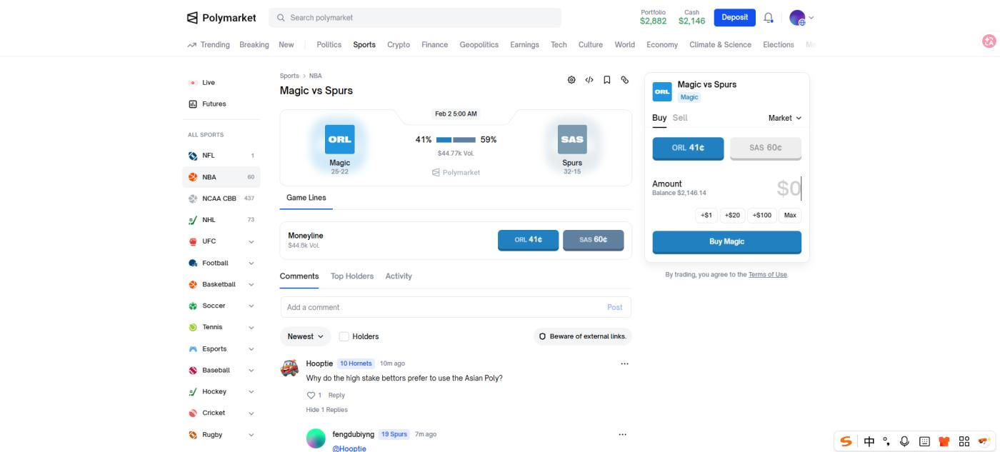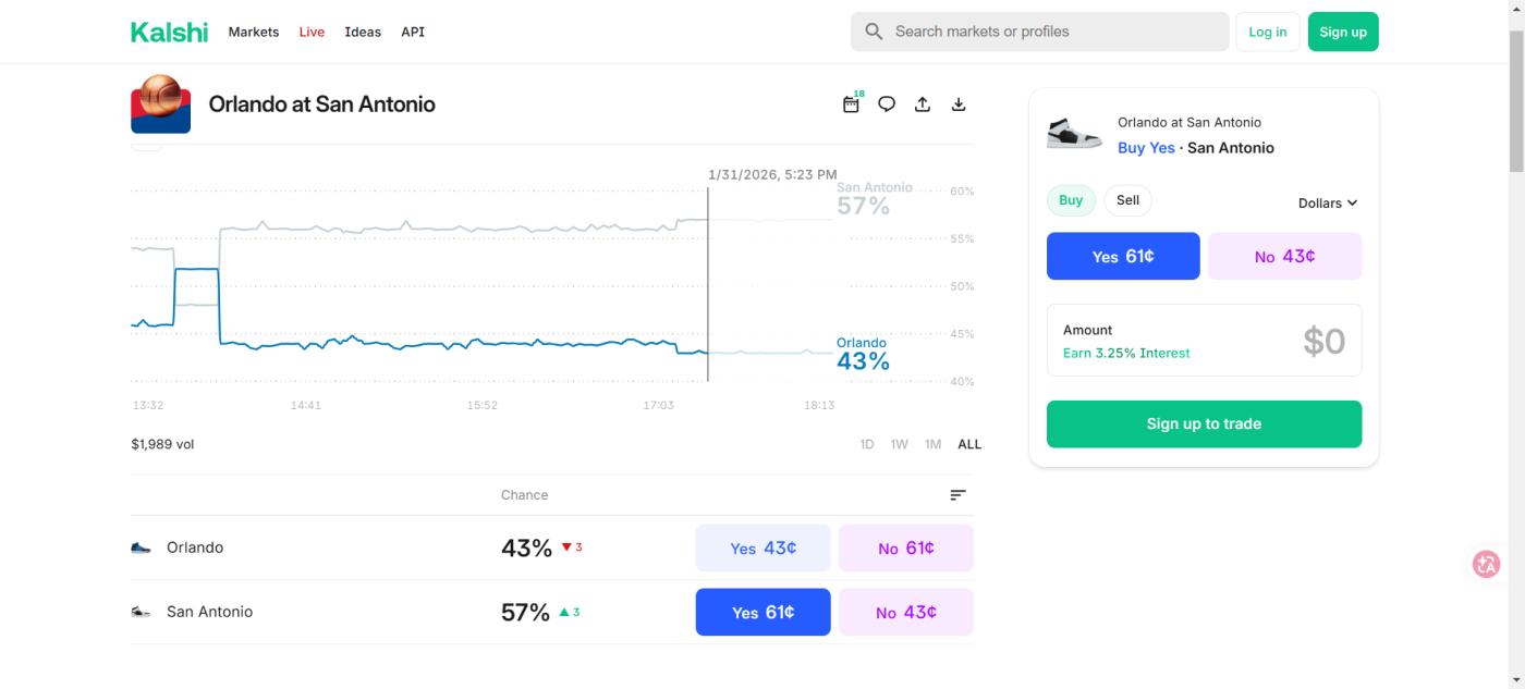 If you bet on the Magic to win (41¢) on platform B and the Spurs to win (57¢) on platform A, the total cost = 41¢ + 57¢ = 98¢.