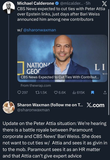 Here comes shameless propagandist and Larry Ellison / David Ellison stooge of $ORCL Bari Weiss doing damage control over at CBS News $PSKY $PARA, after she got caught hiring a known associate of Jeffery Epstein.