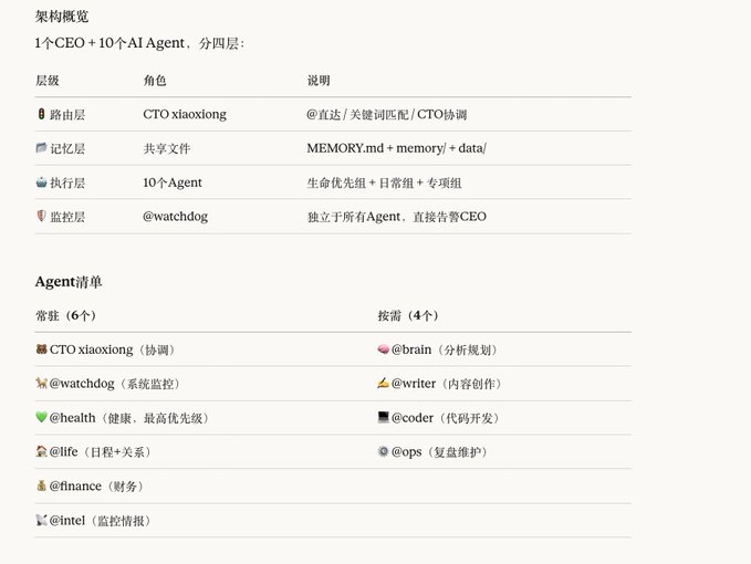 One Mac Mini runs OpenClaw, one CTO coordinates, and ten agents each manage their own tasks, covering everything from waking up to sleeping.