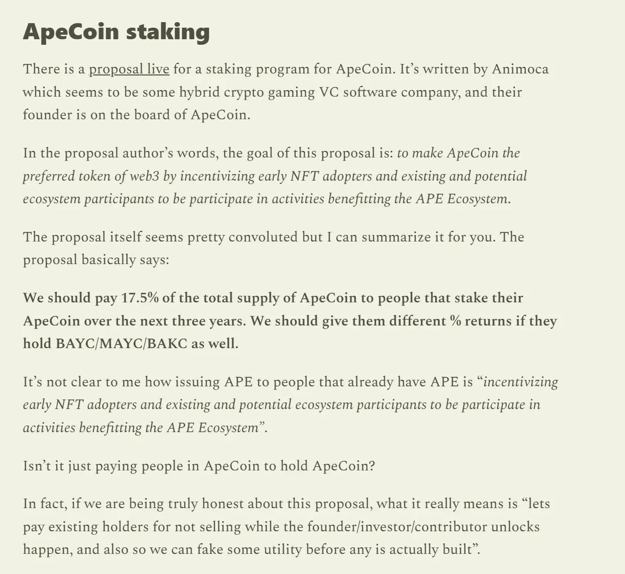 It's worth emphasizing the risks involved. We've seen examples of similar structures historically experiencing serious problems. See this excerpt from Cobie's article: " ApeCoin and the Demise of Staking ".