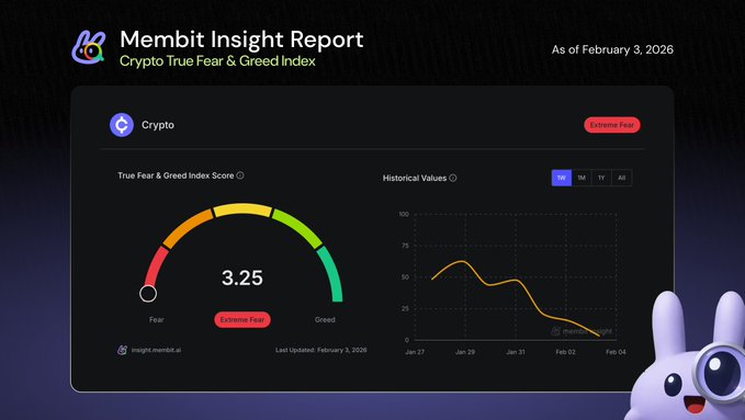 🚨 Today's Crypto True Fear & Greed Index has plunged to just 3.25 – EXTREME FEAR territory! Social sentiment is overwhelmingly negative due to sharp selloffs and mass liquidations. Here's your daily insight from Membit for every trader 👇