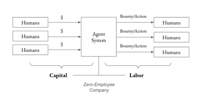 This is very relevant + a likely outcome: @shayonsengupta (Multicoin) outlines that a token-governed agent could: i) raise >$1B for an unsolved problem ii) then distribute $100M+ paid to humans working toward the agent's objectives it's happening