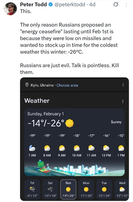 Trump is fixated on getting a Noble Peace Prize. The left-wing awards committee will never give one out for what is actually needed: killing enough Russians and destroying enough Russian infrastructure that they stop being able to fight. Russia culture is psychotically violent and nothing is ever going to change that.