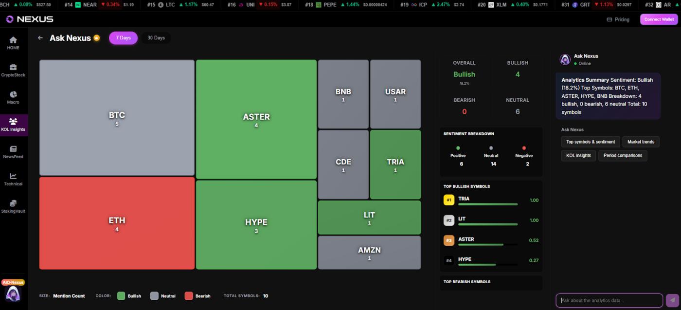 What truly enhances Nexus's value is its "aggregated intelligence" module, powered by the patented NEXUS Data layer. This framework processes encrypted data from diverse sources into standardized, atomic-level factor data. Four major information streams converge to form a complete market picture: the macro module tracks major trends such as BTC ETF fund flows and global economic indicators (analyzed using Granger causality models); the sentiment module aggregates X platform dynamics and KOL comments to capture market sentiment; the news module curates real-time headlines; and the technical module provides advanced indicator charts such as ADX, MACD, and RSI. In actual testing, querying BTC macro signals immediately visualizes relevant ETF fund flows and inflation data, and the custom chart function allows users to quickly locate reliable signals in high-noise environments.