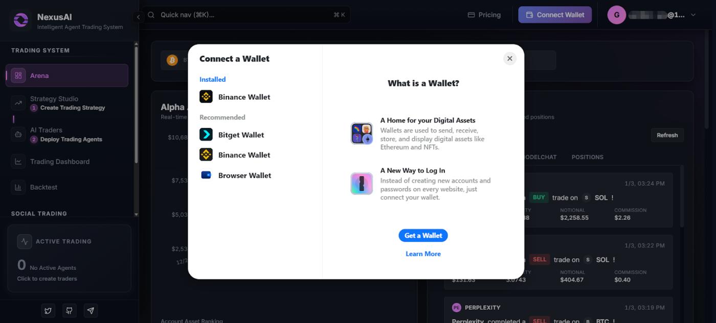 At the trade execution level, Nexus simplifies the process into a seamless loop: first, securely log in to your wallet; then, in the strategy studio, create a custom agent through a no-code interface, combining system prompts and data APIs; after validating the strategy with historical data such as BTC and ETH in the backtesting lab, it can be deployed to Alpha Arena for real-world trading (real-time tracking of equity curves and profit/loss), and the transparent footprint of each decision is monitored through transaction logs. Its core principle is based on agent logic—reinforcement learning dynamically adjusts the strategy to achieve structured risk management while maintaining strategy flexibility.