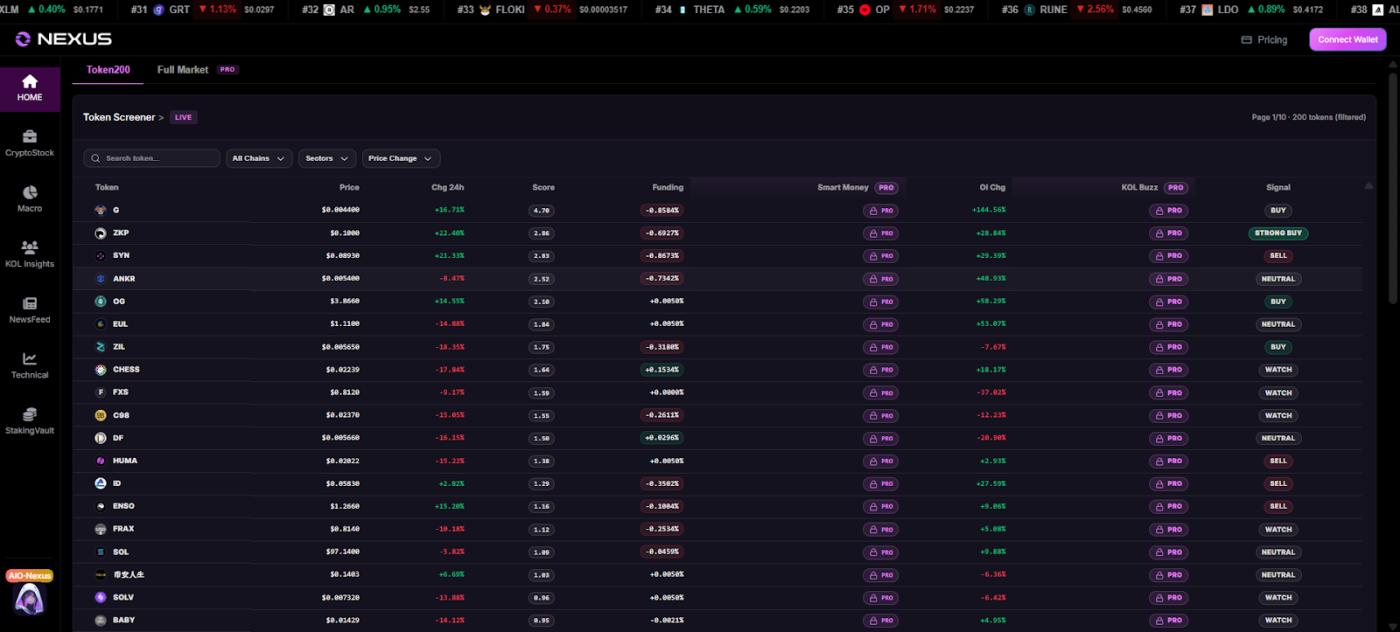 Upon logging into Nexus (via https://nexus.olaxbt.xyz/App or the soon-to-be-integrated BNB Chain DappBay), the first thing you see is the "Command Center"—a streamlined dashboard that integrates fragmented encrypted data into a clear and comprehensive overview. Say goodbye to fragmented tools; this central hub monitors the prices of key assets such as BTC, ETH, SOL, BNB, and AIO in real time, simultaneously displaying the real-time performance of AI agents in Alpha Arena and all trading activities. It serves as the real-time neural center of the OlaXBT ecosystem, accurately capturing digital asset dynamics and efficiently filtering out wash trading and noise interference.