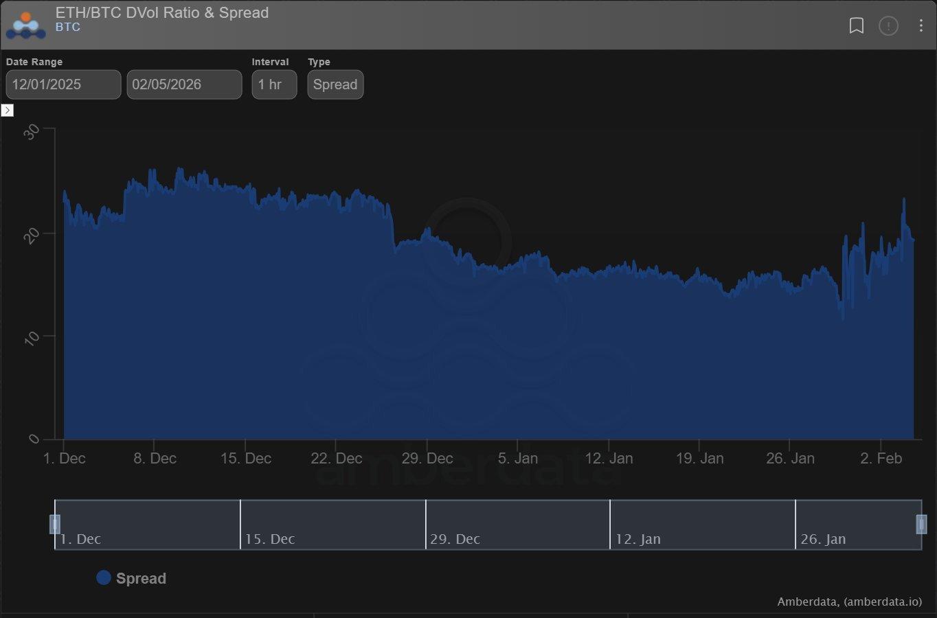 After some ETH-BTC vol spread contraction, the liquidation and Alt hedging has forced the IV spread wider again.