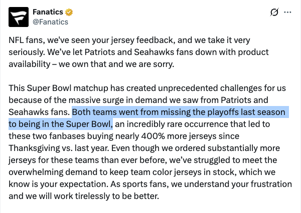 Fanatics has been forced to apologize after running out of Patriots and Seahawks gear ahead of the Super Bowl Their explanation? "sorry your teams were trash last year we didn't expect this"