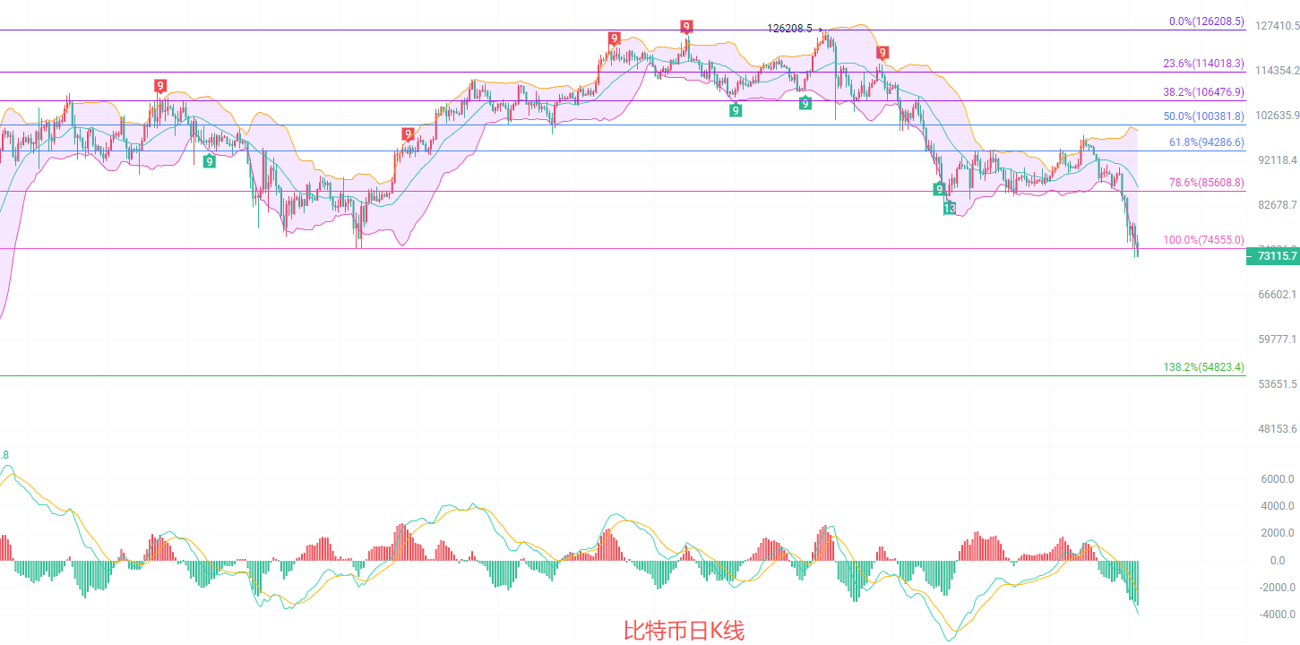 The daily candlestick chart showed a high of 77,000 before this writing. The EMA trend indicator is widening downwards, forming a southward trend. The 15-day EMA has reached 82,700. The MACD shows decreasing volume but increasing momentum, with the DIF and DEA lines breaking below the support level without any signs of contraction. The Bollinger Bands continue to widen downwards, with the lower band reaching 73,700. The SPI has entered extreme oversold territory. Therefore, it is highly likely that the market will continue its southward trend.