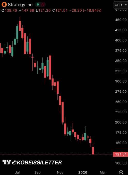 BREAKING: MicroStrategy, $MSTR, hits its lowest level since September 2024 as the company's Bitcoin position nears a -$3 billon loss.
