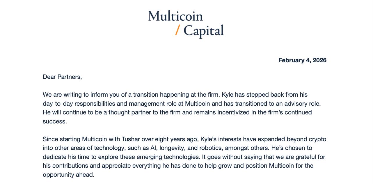 On February 4th local time, Multicoin Capital, a well-known venture capital firm, sent a letter to its limited partners (LPs) stating that co-founder and managing partner Kyle Samani has stepped down from his day-to-day duties and management roles at Multicoin and will assume an advisory role.