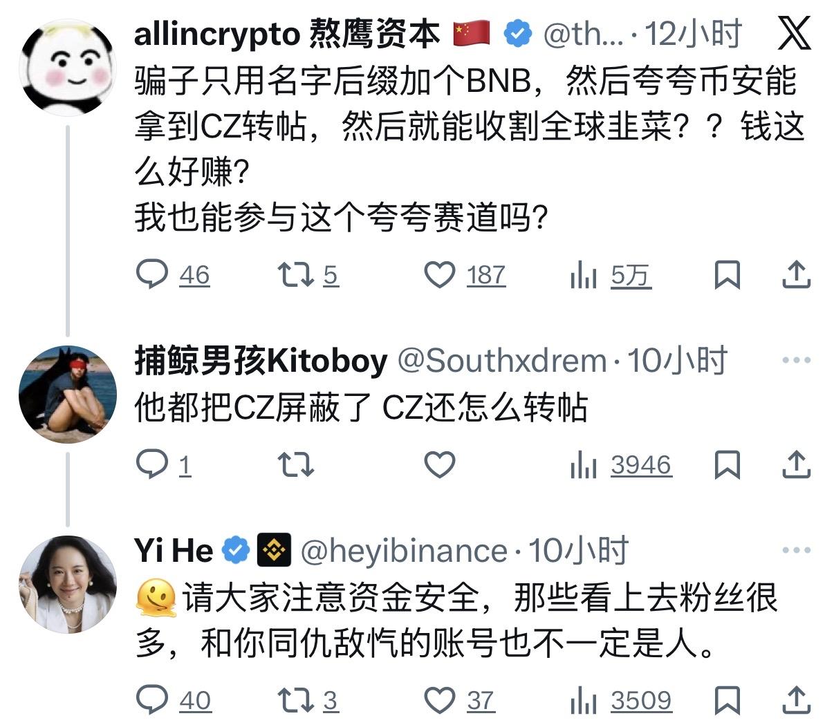 Some bloggers have said that scammers simply add "BNB" to their names, and once they get CZ to retweet their posts, they can gain hundreds of thousands of views and thus reap huge financial benefits.