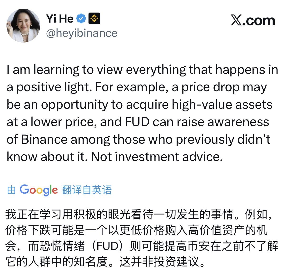 Binance co-founder He Yi stated on social media: "Next time someone fabricates facts, at least look for their real name on LinkedIn. Who would send both a lawyer's letter and a compliance notice at the same time? People who believe this kind of content need to improve their risk assessment skills." Regarding the FUD (Fear, Uncertainty, and Uncertainty) rhetoric, she said she is looking at everything with a positive outlook, which may even increase Binance's visibility among certain groups.