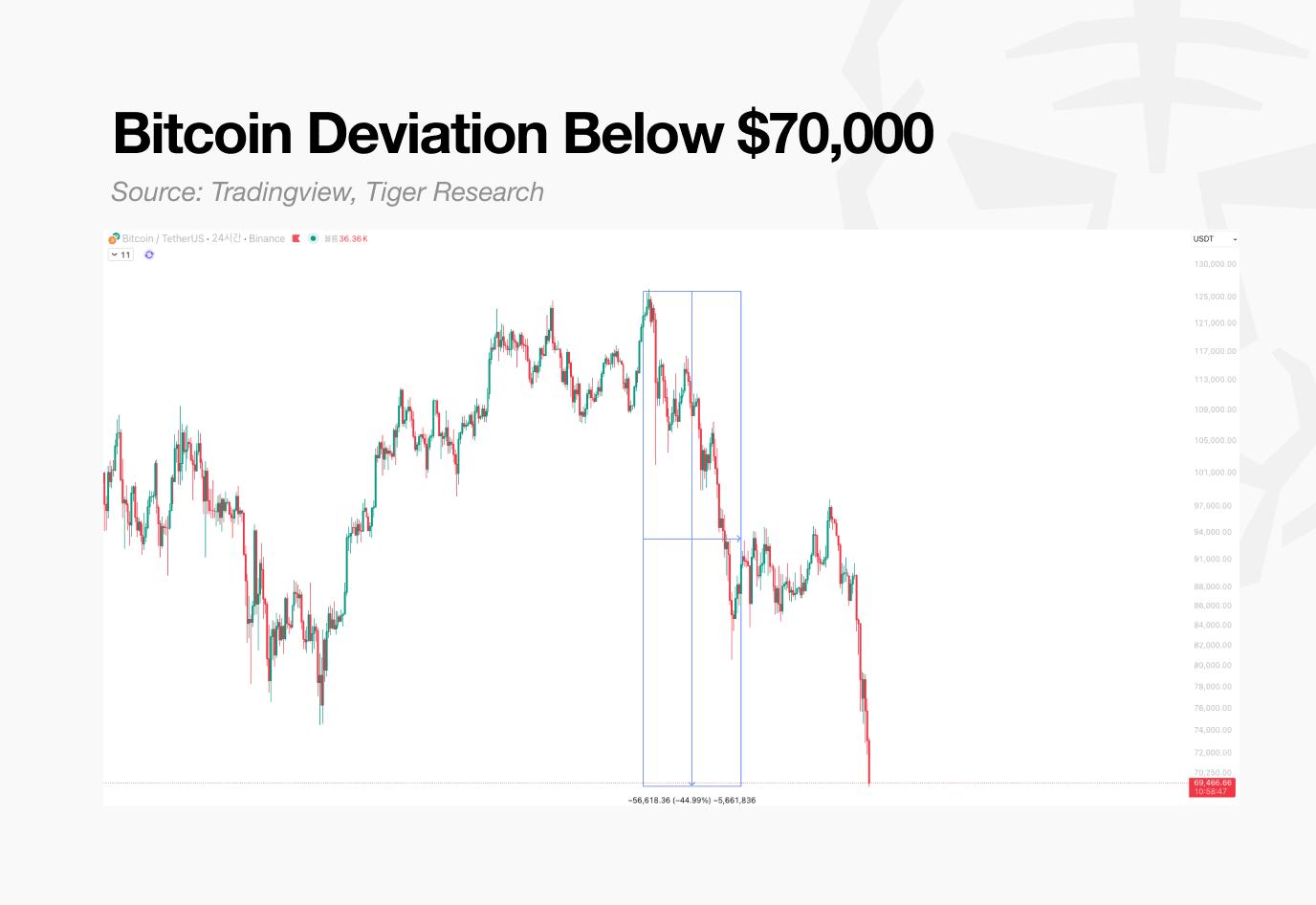 Bitcoin has fallen below $70,000. Among the top 100 cryptocurrencies by market capitalization, only seven remain above their 200-day moving average. This stands in contrast to the Nasdaq 100, where 53 constituents are still trading above the same threshold.