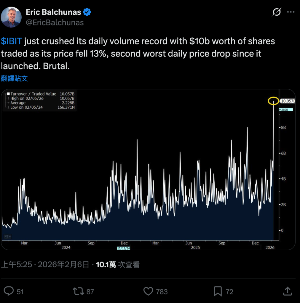 Bloomberg ETF analyst Eric Balchunas said that IBIT "completely broke the record for single-day trading volume," but he also pointed out that massive trading volumes are often accompanied by extreme fear, representing a large number of investors choosing to flee at the same time.