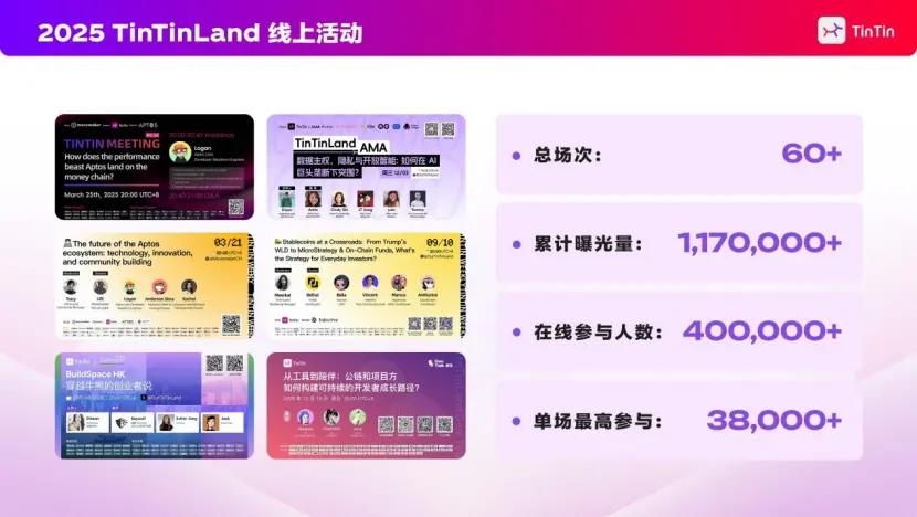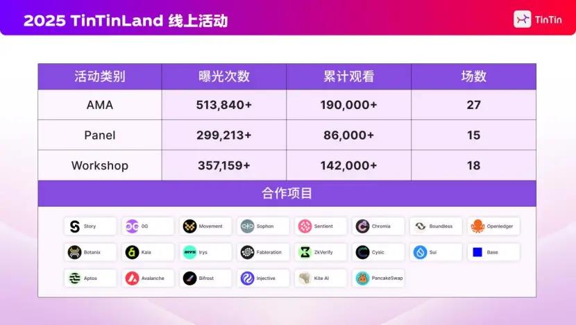 By the end of 2025, the TinTinLand community had grown to over 179,000 members, spanning more than 50 countries and regions. It had partnered with over 200 Web3 projects, becoming a key partner for over 50 mainstream public chains, including Starknet, Injective, 0G, and Sentient, in entering the Asia-Pacific market. Throughout the year, it hosted 131 online and offline events, fostering the development of over 170 demo projects and distributing over $600,000 in prize money and resources.
