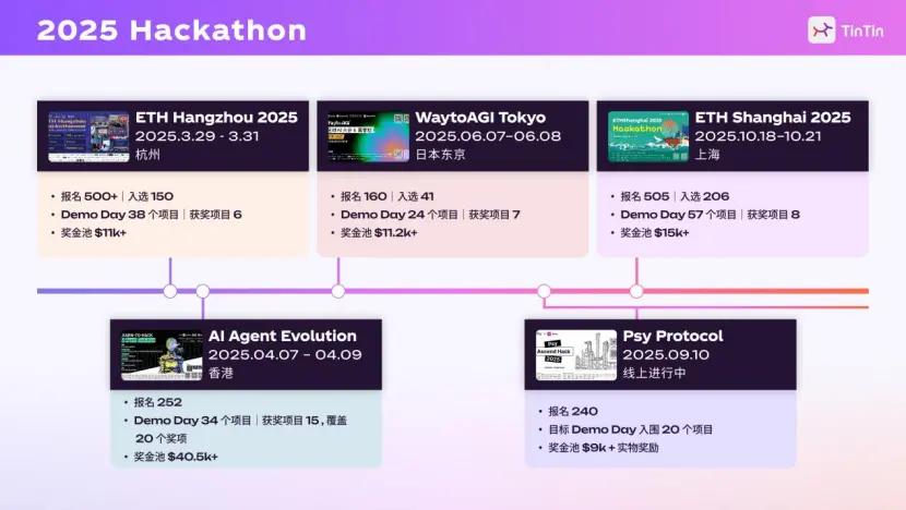 Over the past year, TinTinLand has held multiple regional hackathons in cities such as Hangzhou, Hong Kong, Tokyo, and Shanghai, focusing on topics such as the Ethereum ecosystem, AI Agents, and DeFi infrastructure.