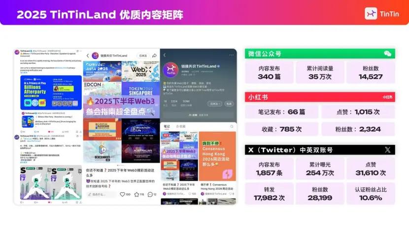 In 2025, TinTinLand built a bilingual (Chinese and English) content matrix, covering WeChat official accounts, Xiaohongshu, and X accounts, and frequently outputting content on developer education, project interpretation, industry trends, event opportunities, and recruitment information.